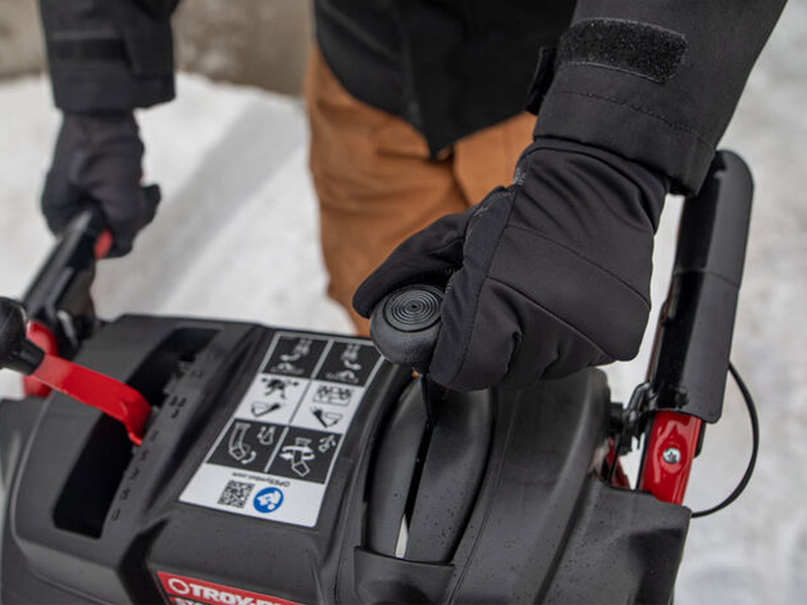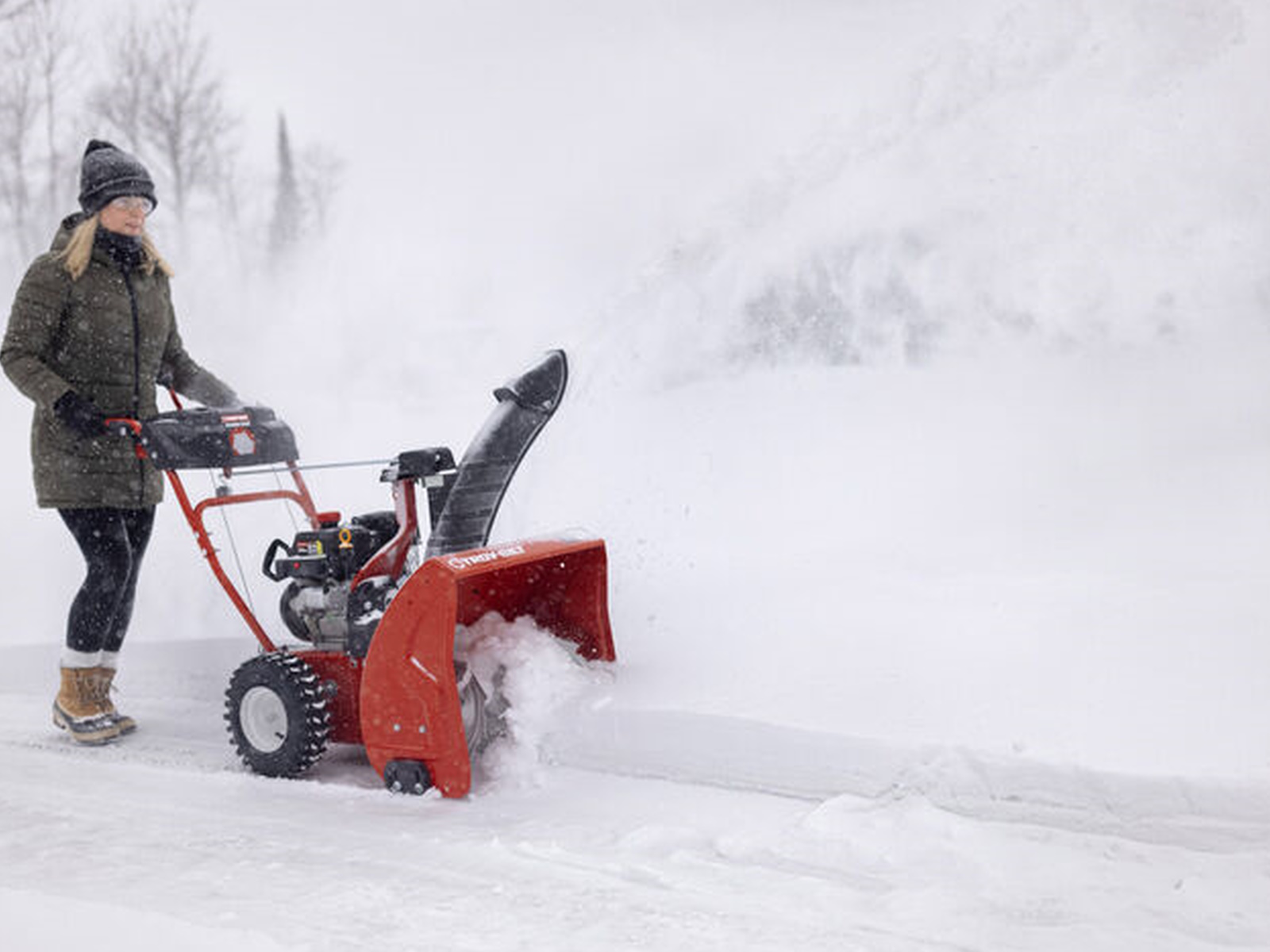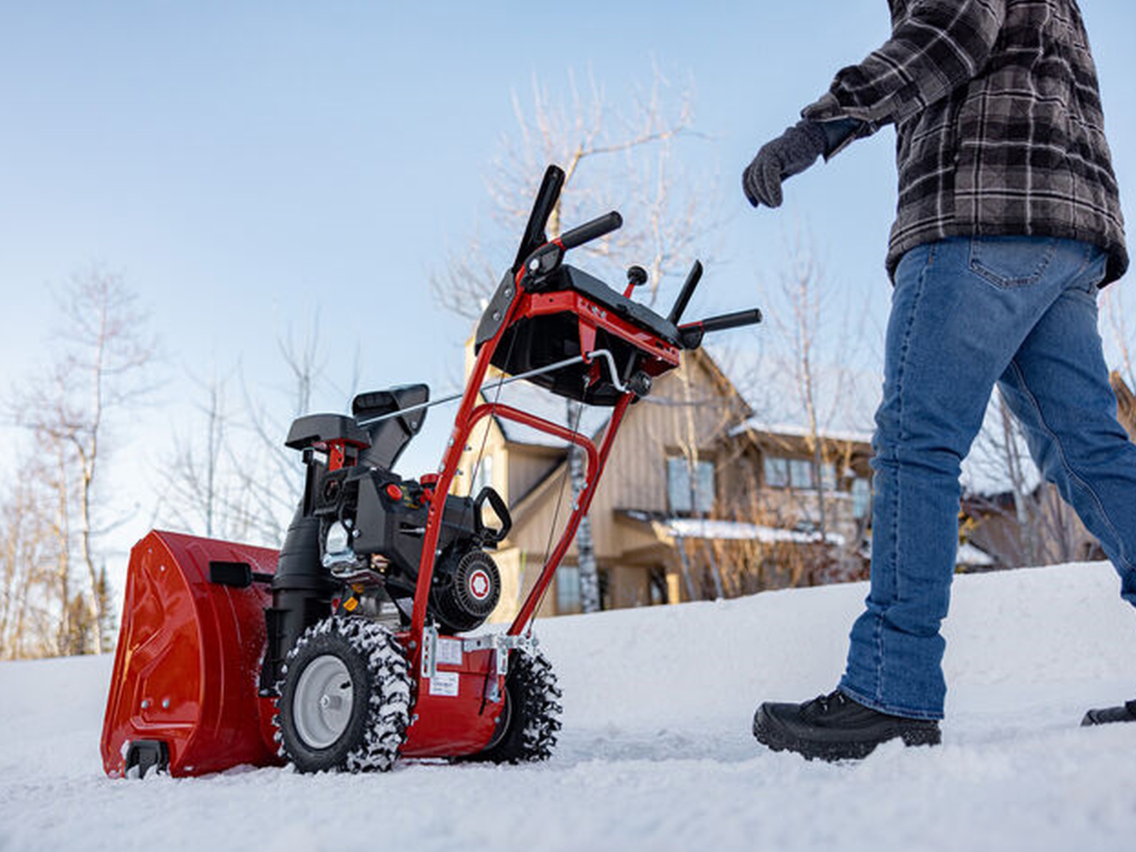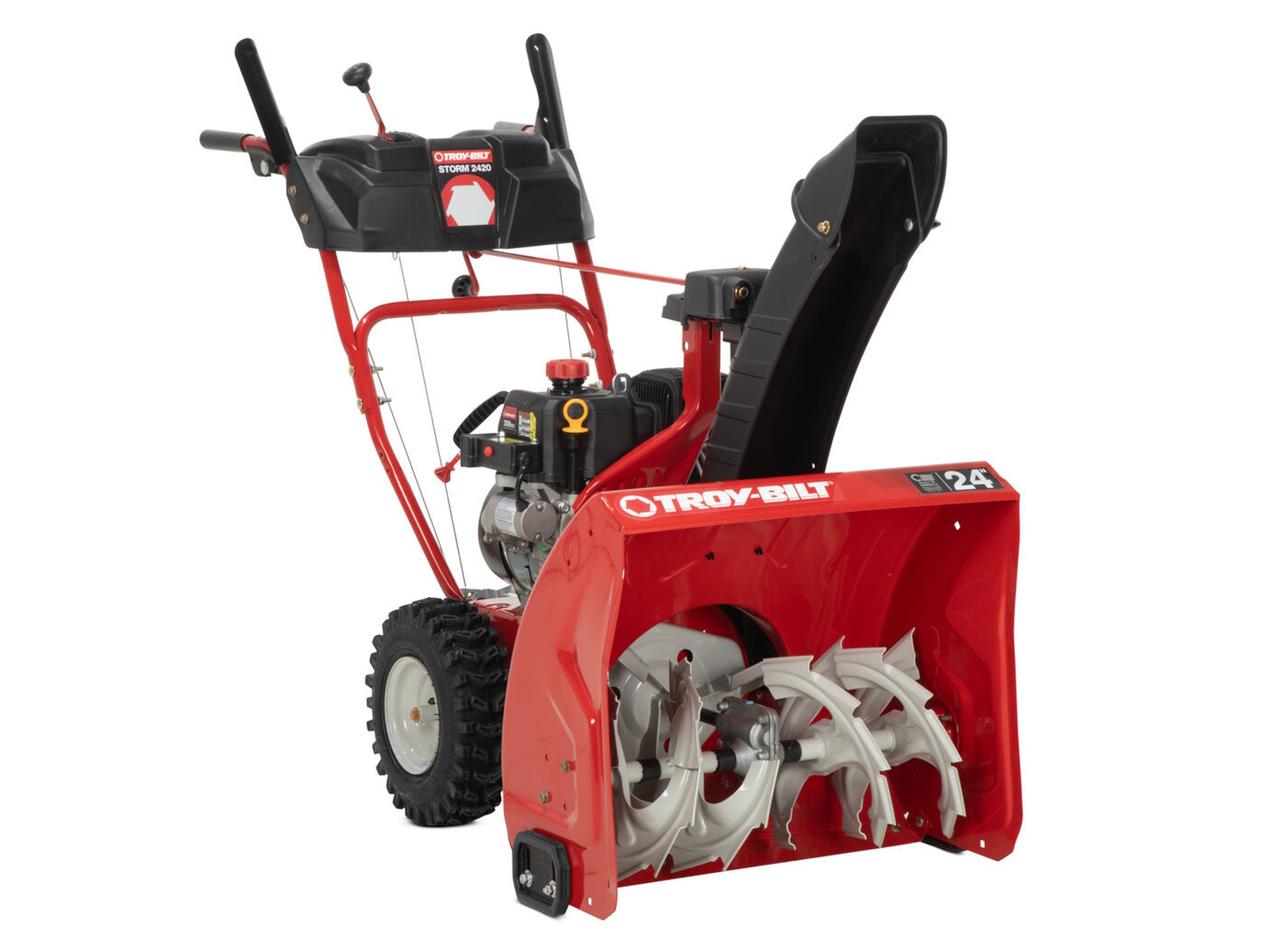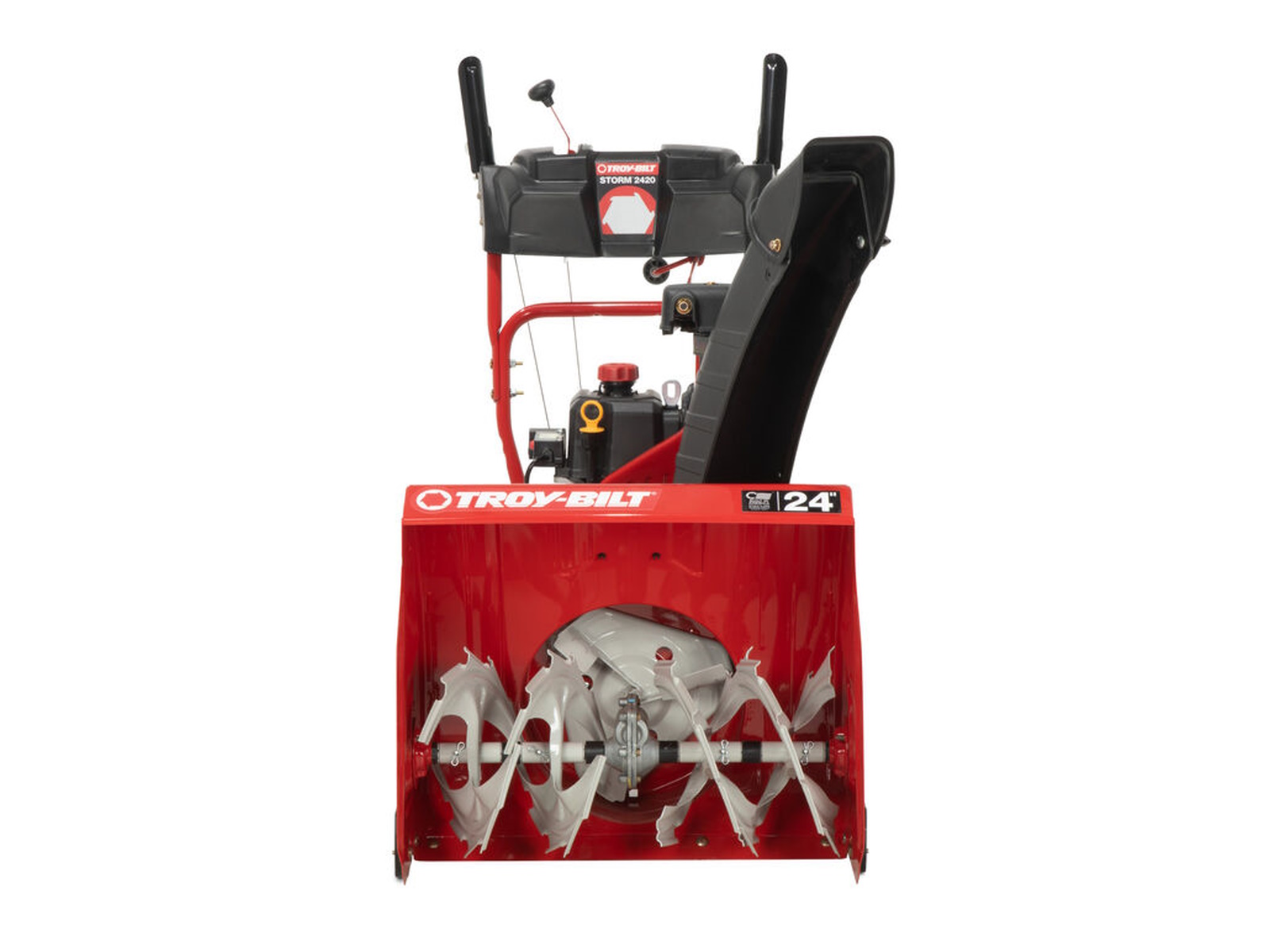 Make clearing snow easy with the Storm™ 2420. The 24" clearing width, powerful 208cc engine, and self-propelled drive system are designed to clear up to 12" of snow. The rugged, 12-in. serrated steel augers are designed to make quick work of snow, and a center-mount chute crank that puts the controls comfortably within your reach. The extended chute is designed to minimize snow blowback on the operator.