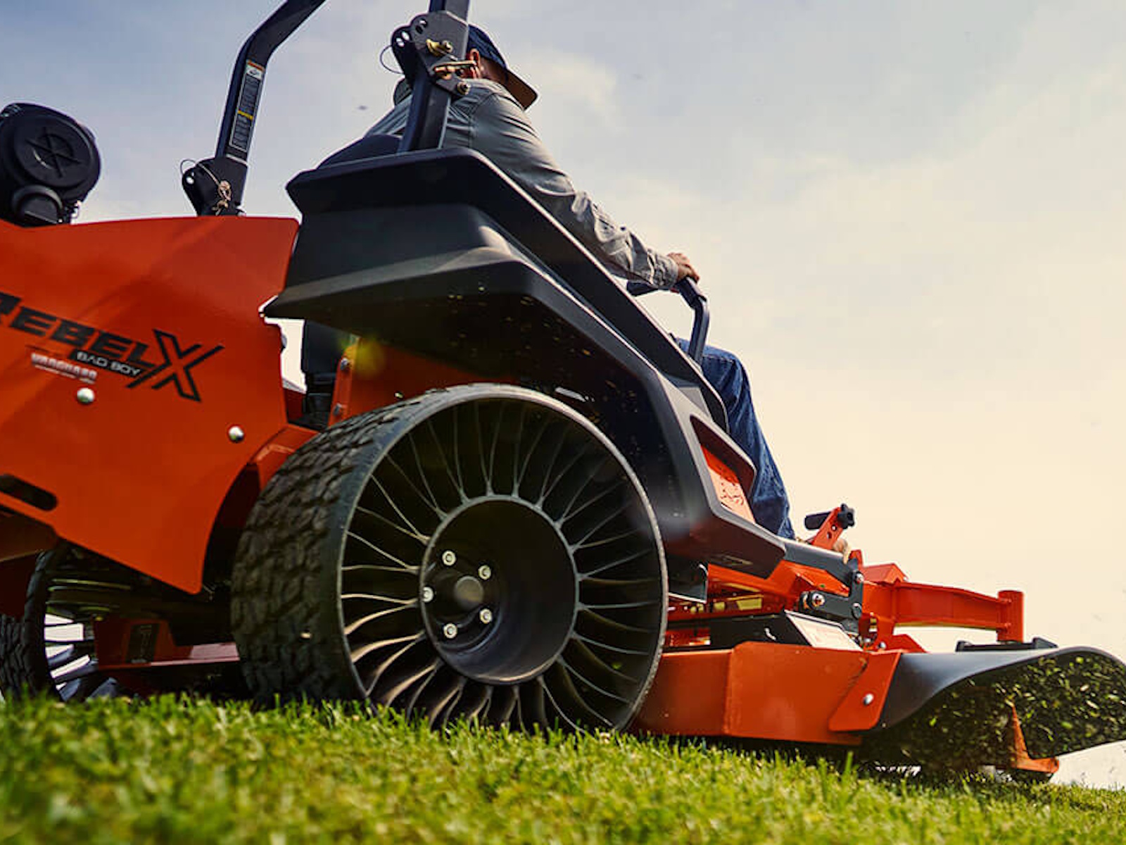 If speed is what you need, you're going to love the Rebel X Zero-Turn Mower. Our newest addition to the Bad Boy line-up has been equipped with 5400 transaxles. They're faster and more robust, so you can take full advantage of any of our powerful engine choices. And you'll be rolling on Michelin® Tweels rear tires with renowned run-flat technology. These tires come with a revolutionary rear tread pattern that grips like a glove, so you can confidently mow any terrain. This mower also includes a striping kit, new floorboard mat, square drive arms and grips, plus a standard deck step. If you want to mow with an attitude, these innovations continue to change the game.